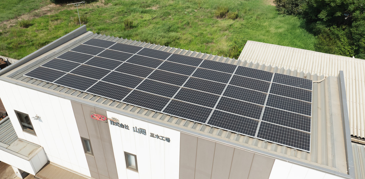 (株)山陽 加西工場では、出力約1MW(1,000kW)の大規模ソーラー発電システムを導入し、地球温暖化対策のための省エネ事業の一環として、得られた電力を有効に活用しています。